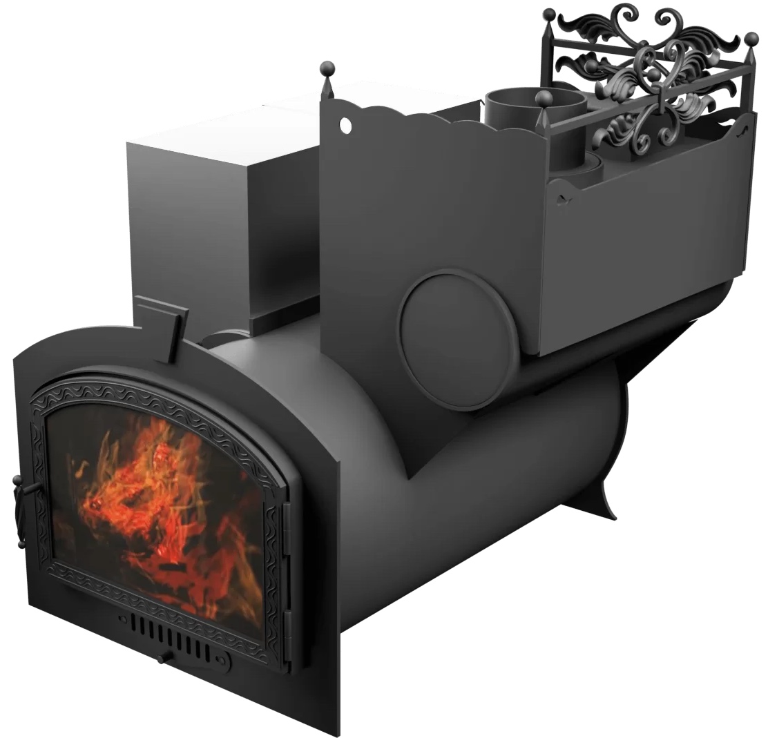 Лидер,не имеющий аналогов, по обогреву бань с отдельным моечным отделением. Большая панормная дверь с термостойким стеклом фирмы ROBAX . В конструкции печи предусмотрен обдув стекла, дымосборный короб, для гермитизации используется высокотемпературный силиконо-керамический термошнур, уложенный в специальный паз. Створка двери выполнена из кованной полосы.